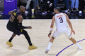 LeBron James #23 of the Los Angeles Lakers performs a layup as Mark Williams #15 of the Phoenix Suns defends the basket during their regular season NBA game on Friday April 10, 2026 at Crypto.com Arena in Los Angeles, California. Lakers defeat Suns, 101-73. ARIANA RUIZ/PI